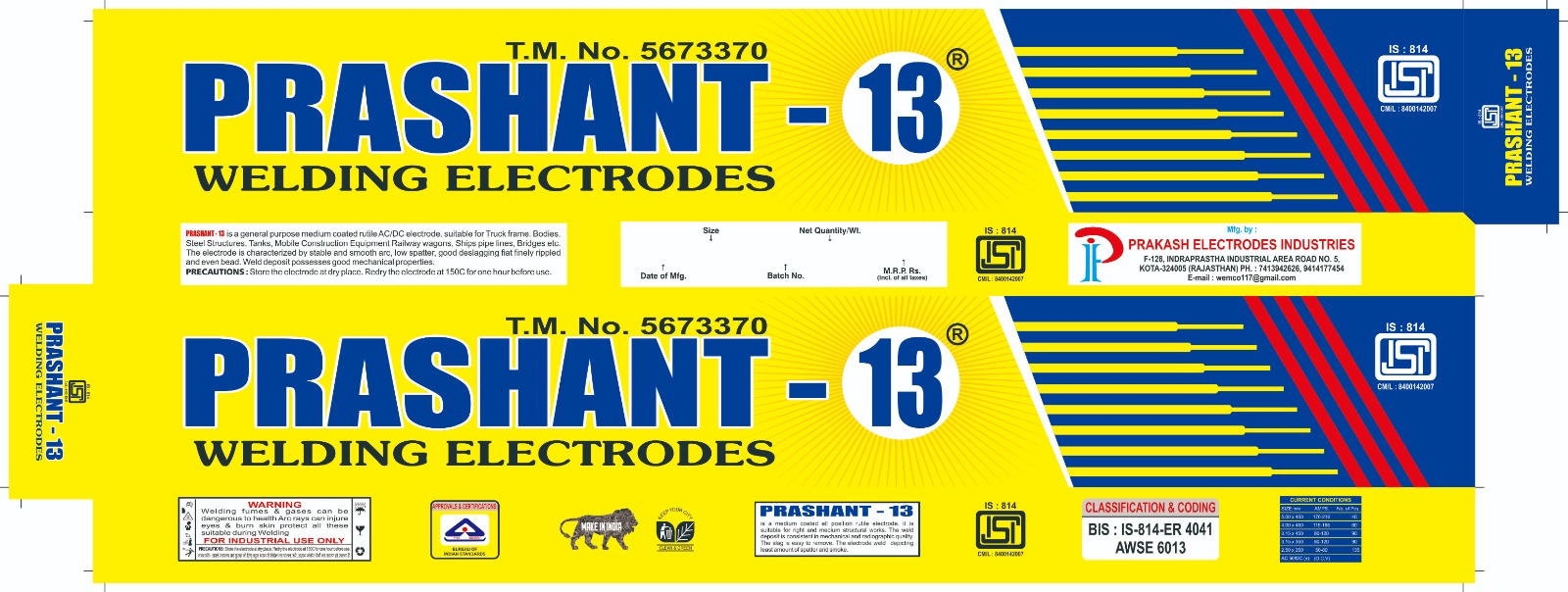 Prashant 13 is a dependable choice for fabrication professionals seeking smooth, stable welds in medium-level applications. Specially formulated by Prakash Electrode Industries, Kota, this electrode is best suited for grill works, gates, windows, furniture frames, and other medium fabrication jobs where precision and durability matter.